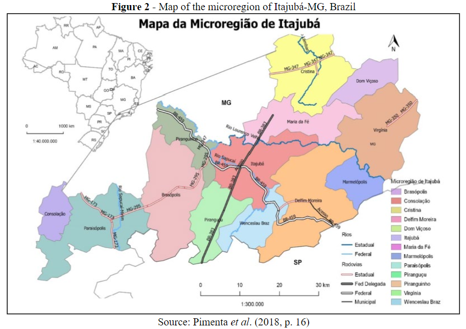 The Microregion of Itajubá (MRI) is situated in the mesoregion of the South-Southwest of Minas Gerais (Figure 2) and is composed of 13 municipalities: Brazópolis, Consolação, Cristina, Delfim Moreira, Dom Viçoso, Itajubá, Maria da Fé, Marmelópolis, Paraisópolis, Piranguinho, Piranguçu, Virgínia, and Wenceslau Braz, having as its seat the municipality of Itajubá. This is the oldest municipality, founded in 1819 and historically influenced by the colonization and Christianity, of Portuguese origin, visualized in colonial monuments, churches, and devotional celebrations (IBGE.Cidades, 2018).