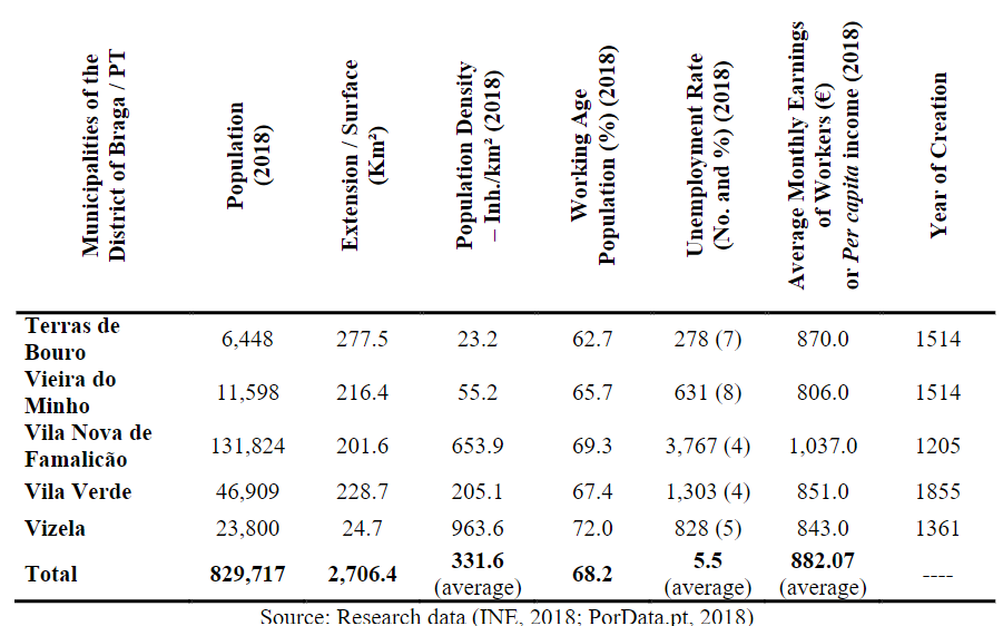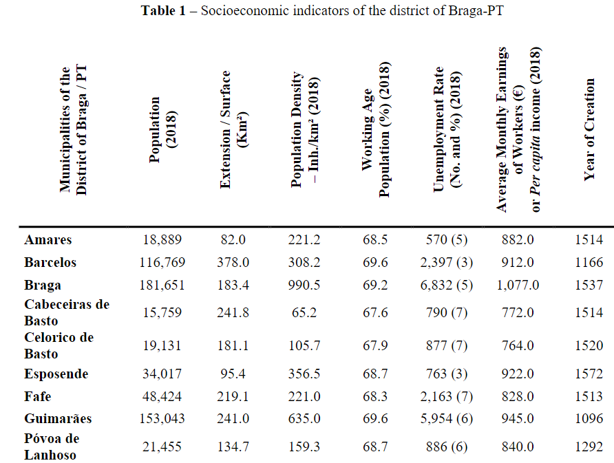 As for the selection of the secondary data, some clarifications are necessary. The census surveys occur every ten years in both countries, with the next surveys werepredicted for 2021 in both. In this sense, the information relevant to this research -population, population density, unemployment rate, and average monthly wage per capita of the workers - are available in the estimates modality and date from 2017 (Brazil) and 2018 (Portugal). Moreover, the economic data of the MRI was converted into Euro, the currency of the European Union, regarding the purchase values in the exchange market (R$ 3.9672 per 1.00 €) of the antepenultimate day of the year (12/29/2017), a choice made due to the stability of the European currency. The pieces of information were drawn up as a panoramic device that depicts the reality and points to the importance of culture, tourism, and locality in the leveraging of regional development, and signals the evidence of the development aspects that agents shall consider.