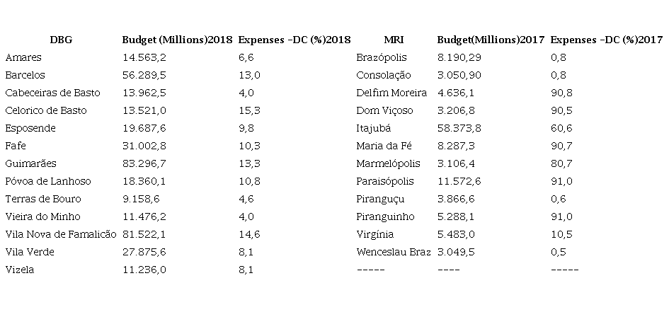 Itajubá (58,373.86 €) and Braga (94,171.8 €) record the largest budgets and establish distinct relevance to culture in terms of resource allocation, since all municipalities in the MRI budget indices below 1%, except for the municipality of Paraisópolis, in which the budget reached 1%. In the DBG, the budget is higher, although it is conjugated with sports. Even so, this is still an indication of greater concern with culture, seeing that the data illustrate the reality and confirm that the public power (and private agents) have a role of relevance in leveraging local development alternatives, namely within the scope of creative activities (tourism, creative economics, and culture). It also denounces that the municipalities conserve, in their territorial domains, elements of material and immaterial culture and natural and architectonic resources of high value.