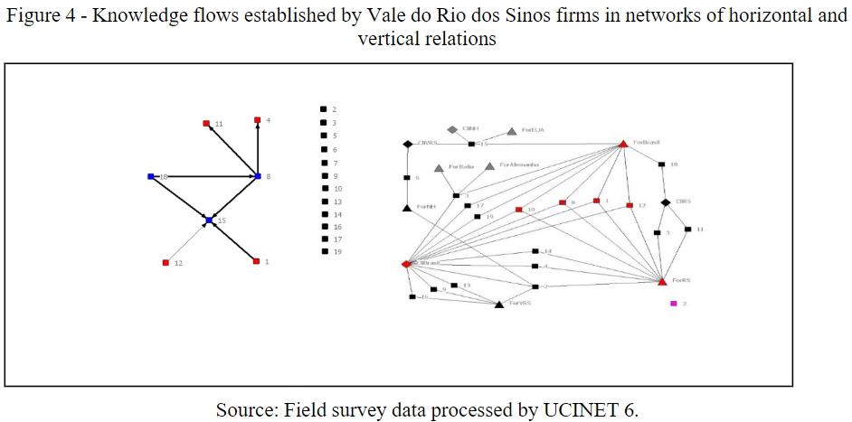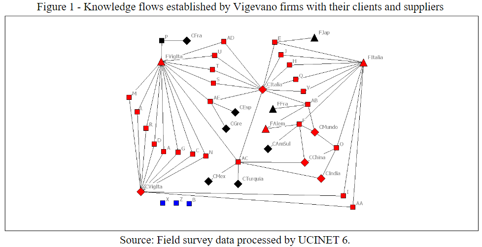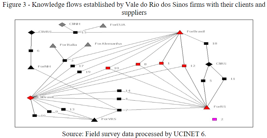 We also highlight that for the Vale dos Rio dos Sinos network, no other clients beyond the national ones were cited. This situation is different from the one observed in the flow of technological knowledge in the Vigevano network, where other clients, besides Vigevano, were mentioned such as Pavia, Italy, and Europe, located in several parts of the world. Those firms in Vigevano play a role in knowledge exchange because they extended the knowledge flow by including foreign actors