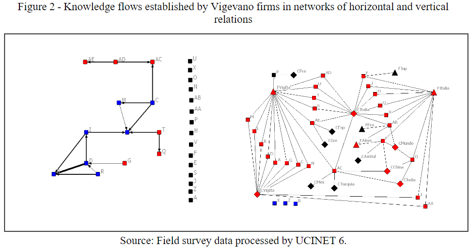 It is important to compare the network of vertical knowledge flows with the network representing horizontal knowledge flows. Figure 2 presents the two networks identified for Vigevano in the field survey, allowing for that comparison.