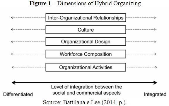 Thus, organizational hybridism represents a field of studies focused on the possibility of coexistence of different strands, objectives, parts or organizational formats to pursue common organizational goals (WOOD JR., 2010). The hybrid organizations' result of this process has, for example, their economic, social and environmental aspects juxtaposed in the same organizational format, aiming to achieve specific market niches and meet the specific demands of their public (CHU; WOOD JR., 2008).