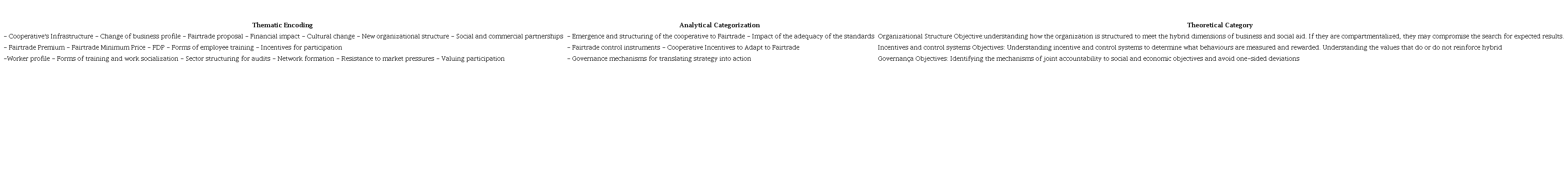 The data were analyzed using the content analysis technique, adapting the protocol developed by Sonpar and Golden-Biddle (2008). This protocol was then developed in four steps: 1) Floating Reading of the data; 2) Thematic Coding; 3) Analytical Categorization; 4) Theoretical Categorization.