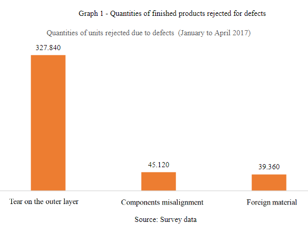 The defect is the result of a deviation between what was planned and what was produced. It is the effect of some incorrect action performed, such as a mistake made by people or equipment or material failure. Therefore, the defect is the nonconformity of a certain quality characteristic based on specifications (PALADINE, 2012; SLACK et al. 2013; ROLDAN; FERRAZ, 2017; BIANCHI; FERRAZ Jr., 2020). The defects shown in Graph 1 are described below.