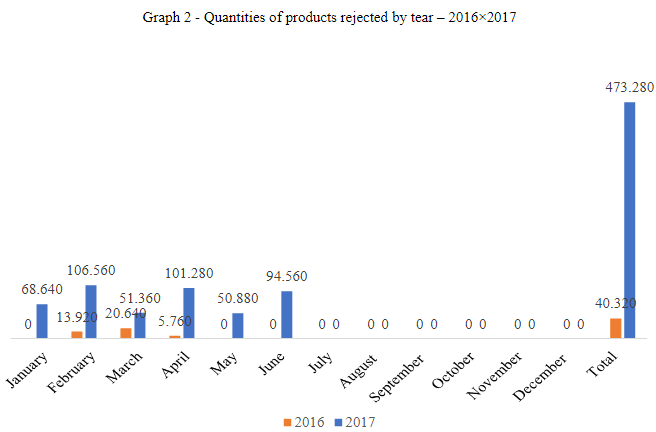 It was diagnosed, according to graph 2, that there was an increase in rejectionsper tear; after April 2016, there were no rejections, but at the beginning of 2017, the rejections restarted in an exorbitant way compared to the numbers in 2016 and 2017.