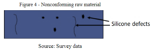 Figure 4 shows the nonconformity of the raw material; that is, it was done out ofthe project’s specification (SLACK et al., 2013). Highlighted dots and scratches have silicone defect. This defect causes tearing when removing the central tape from the outer layer of the finished product.