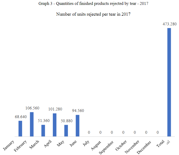 Graph 3 shows the quantity of finished products rejected for quality before and after the interventions were carried out. As seen from July to December 2017, there was no unit rejected for tears, thus solving the problem of conformity with the presented specification (SLACK et al., 2013; BIANCHI; FERRAZ Jr., 2020).