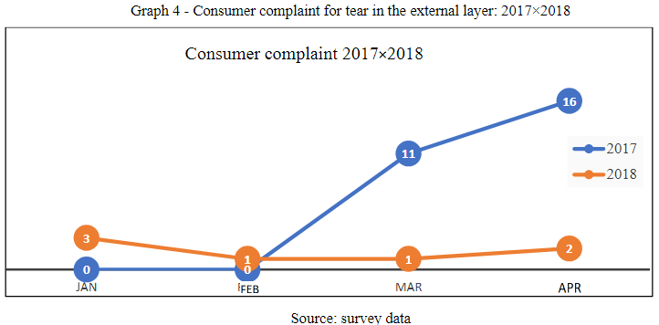 Graph 4 shows the number of consumer complaints due to tears in the external layer. In 2017, there were a total of 27 complaints; in 2018, there were 4 complaints. Thus, in 2018, there was a reduction of 85.18% compared to the same period in 2017. The drop in the number of complaints demonstrates that the applied quality actions had the expected effect, impacting customer satisfaction and, therefore, quality (SLACK et al., 2013; MANNES et al.,2018; FEITEN; COELHO, 2019; BIANCHI; FERRAZ Jr., 2020).