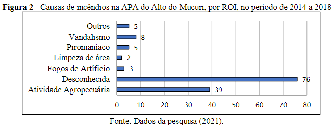 The highest amounts of fire occurrences were in 2014 (45), 2018 (37), and 2015 (36), with the municipalities of Ladainha (56.52%) and Itaipé (23.19%) holding the highest percentages of registered ROIs. About 90.58% (125) of the records analyzed occurred in the municipalities' rural areas. According to Medeiros and Fiedler (2004) and Mistry and Bizerril (2011), fires in rural areas may be related to pasture renewal, clearing for agriculture, animal hunting, illegal extractivism, wood smuggling, or use in charcoal manufacturing. This situation can be observed in Figure 2, which shows that the agricultural and livestock activity had a relevant result (28.26%), along with the unknown causes (55.07%).