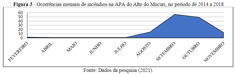 The monthly history of forest fire occurrences coincided with the critical period reported in scientific literature. For Santos, Souto, and Souto (2018), this critical period occurs between August and September, predominantly the dry season, which favors fire incidence. In Figure 3, it is possible to notice higher rates of forest fires between August to November, with emphasis on September and October, which reached the percentages of 40.58% (56) and 35.51% (49), respectively, concerning the occurrences of total fires.