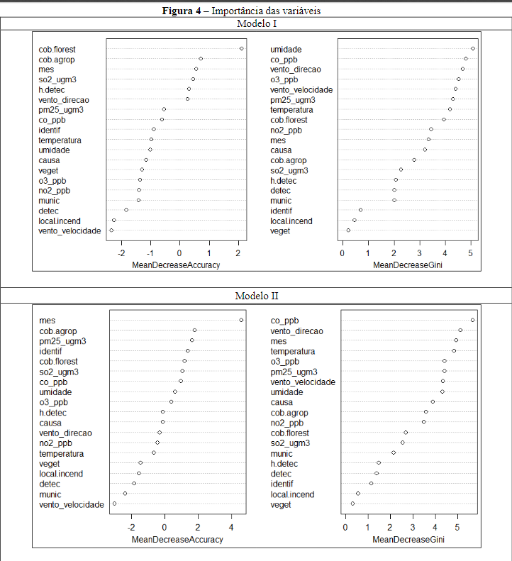 Regarding the application of Random Forest in Models I (random) and II (chronological), both verified an accuracy of 48.78%, with better predictive capabilities for low and moderate environmental damage. The determining factors for fire occurrence were measured in two parameters: the MDA, which resulted in the most relevant variables Agricultural Cover, Month, and Natural Forest Cover; and the MDG, with the variables Carbon Monoxide, Wind Direction, and Ozone Concentration, as the most important in the model.