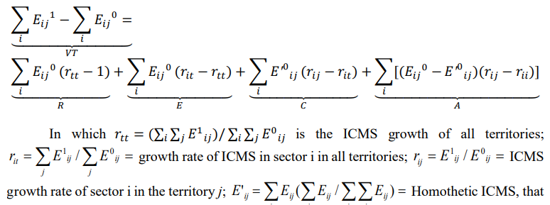 In the present analysis, the core variable used is ICMS collection and not employment as traditionally seen in the literature. Therefore, the homothetic ICMS (E'ij) shows the ICMS in sector i in region j if the productive structure is equal between the region and the total of regions. From this point, the regional ICMS growth in relation to sectors is divided into: regional variation (R), structural variation (E), differential variation (D), competitive effect (C), and allocation effect (A). The regional variation identifies how much the ICMS of a particular region would increase if it grew the growth rate of the reference region.