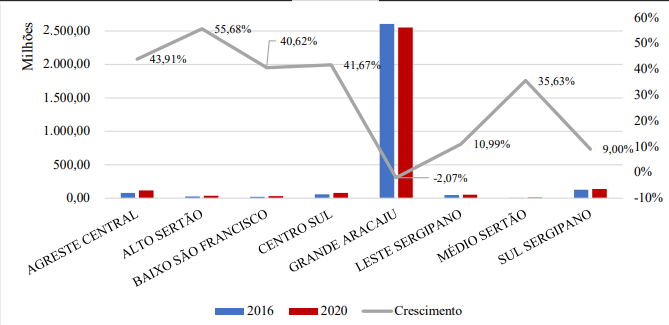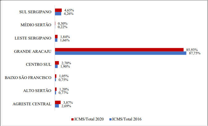 Grande Aracaju, a planning territory which includes the municipalities of Aracaju, Barra dos Coqueiros, Itaporanga d'Ajuda, Laranjeiras, Maruim, Nossa Senhora do Socorro, Riachuelo, Santo Amaro das Brotas and São Cristóvão, has always concentrated most of the ICMS tax collection (tax on operations relating to the circulation of goods and on interstate, intermunicipal and communication transport services, or Tax on the Circulation of Goods and tout court Services). This fact testifies to the concentration of economic growth , since, due to its high tax burden, the ICMS is understood to be an essential component of the national added value (PAULUS, 2020). In this sense, the intent of PSDI was to seek better economic planning and to deconcentrate industry in order to favor economic expansion beyond metropolitan region (Teixeira, De Melo, & França, 2011).