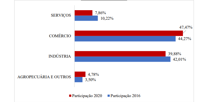 According to Graph 1, it can be observed that in the years 2016 and 2020, respectively, the participation of Grande Aracaju in the total collection of ICMS in the state was 85.93% and 87.75%, with the Sul Sergipano territory taking second place, with a participation slightly higher than 4% in both years, mainly due to the industrial production in the region, such as the textile and beverage industries. Graph 2 outlines the revenue collection by sector.