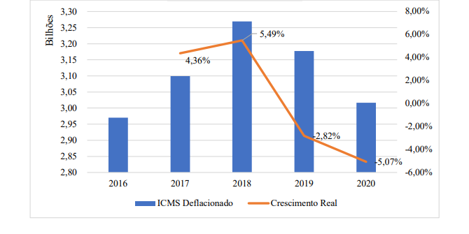 When analyzing the participation of ICMS collection by sector in 2016 and 2020, one notices a drop in the participation of industry and services in the state economy. Such drops can be attributed to the effects of the pandemic, which, although it started in 2019 in China, its major effects arrived in Brazil in 2020, affecting several economic sectors. On the contrary, commerce sector gained importance in ICMS collection, increasing its share from 42.27% to 47.47%. Agriculture and Husbandry and Others sector also showed an increased participation in the period from 2016 to 2020. Even though, within the entire period between 2016 and 2020, the ICMS had nominal growth year by year for Sergipe state, when deflating the data using the IPCA, it can be seen that in the years 2019 and 2020, there was no real growth in revenue. Graph 3 outlines the real growth as well as the levels of ICMS collections.