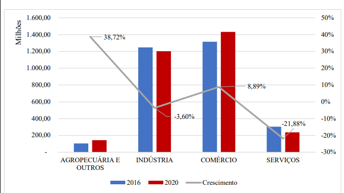 Evaluating the accumulated growth of sectorial ICMS collection in the period of 2016- 2020, as shown in Graph 5, we also have something that corroborates the deindustrialization thesis. Not only did the industry's share in total revenue drop, but also the real value of its collection (-3.6%). However, the Trade and the Agriculture and Livestock and Other sectors had growth of 8.89% and 38.72%, respectively, in the period. For Cunha (2019), considering the entire Northeast region, the biggest change in employment is due to the increase of labor in low productivity activities.