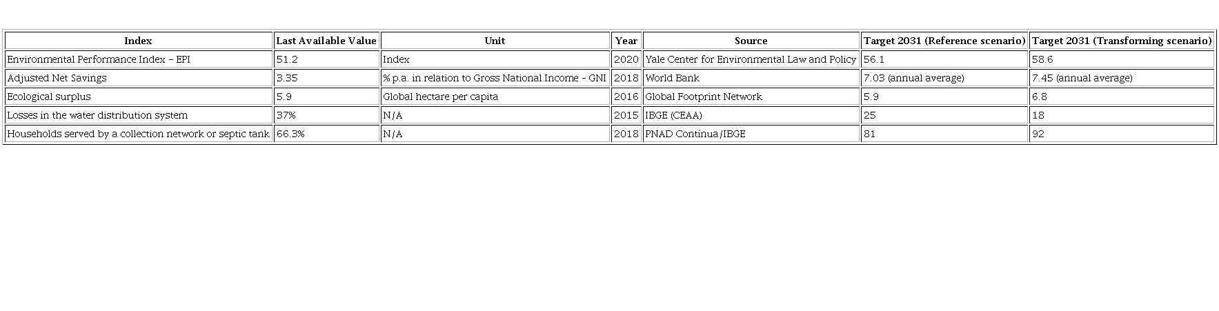 Decree 10.531/2020 of the Presidency of the Republic establishes the federal development strategy for Brazil in the period from 2020 to 2031 (BRASIL, 2020). Table 3 presents the indicators and targets established for the environmental axis. For this axis, the guiding principle is based on promoting conservation and sustainable use of natural resources. It is recognized that environmental quality is one of the fundamental aspects of people's quality of life, as well as the need to reconcile the preservation of the environment and economic and social development. Concerning water and sanitation, three key indices were established. The first refers to the control of losses in the distribution network, with a target of reducing the base value from 37% to 25% in the reference (or probable) scenario and 18% in the transforming (or optimistic) scenario by 2031. The second refers to the removal of sewage by the collection network or septic tank, with a target of the evolution of the base value from 66.3% to 81% in the reference scenario and 92% in the transforming scenario. Last but not least, the treatment of collected sewage, with a target of progression of the base value from 46% to 77% in the reference scenario and 93% in the transforming scenario (BRASIL, 2020).