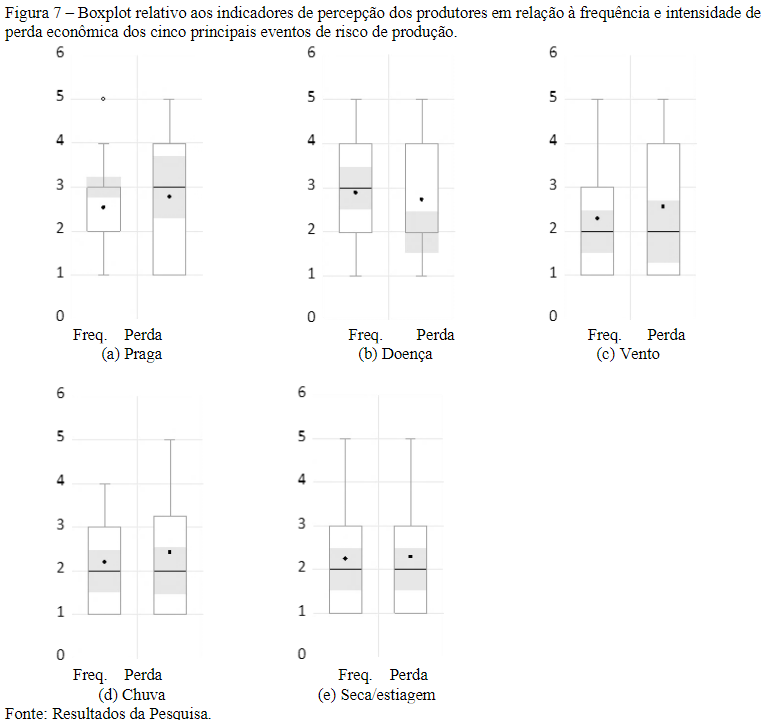 A frequência do evento e o potencial de perda financeira foram calculados a partir de questões que envolveram escala Likert, de 1 a 5, em que (1) indicou nível muito baixo e (5) nível muito alto. Como exemplo, o produtor indicou, de (1) a (5), o nível de frequência de ocorrência de pragas em sua atividade, assim como sinalizou a magnitude de perda financeira caso o evento se efetivasse. Observa-se, assim, que, de acordo com a equação (1), o grau deseveridade possui uma escala de 1 a 25 pontos.