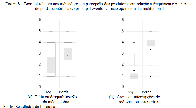 Com relação aos riscos de crédito, estes não se mostraram como eventos preponderantes, pois parte da amostra é membro de cooperativa. Estas garantem respaldo aos produtores frente às situações de inadimplência e facilidade de acesso a financiamento. Ademais, os produtores independentes relataram ser prática comum o recebimento de pagamento antecipado ou à vista e, desse modo, também não possuem problemas com inadimplência.