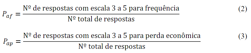 A partir das respostas dos produtores, calcularam-se as probabilidades de o evento ter elevada frequência de ocorrência (Paf) e alto potencial de perda financeira (Pap) – equações (2) e (3), respectivamente.