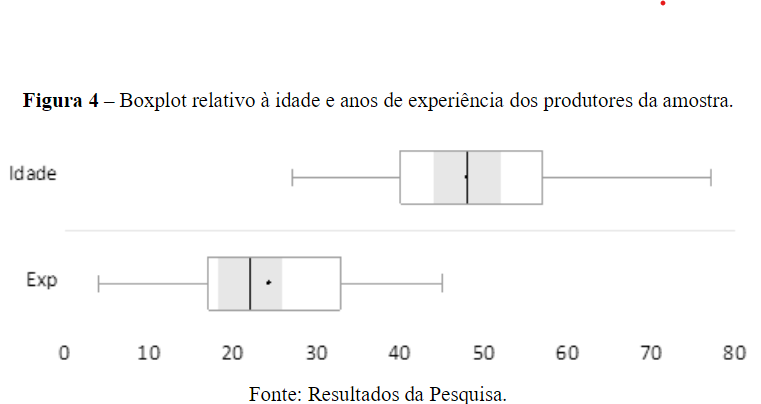 A partir das entrevistas realizadas, observou-se que a idade média do produtor da amostra foi de 47 anos. Outro dado interessante é que a média de tempo de experiência na atividade florícola é de 24,31 anos, ou seja, pouco mais da metade da idade média do produtor – Figura 4, confirmando a tradição das famílias produtoras na região. Além disso, mais de 65% dos entrevistados possuem formação universitária, ou seja, trata-se de um grupo com alta escolaridade.