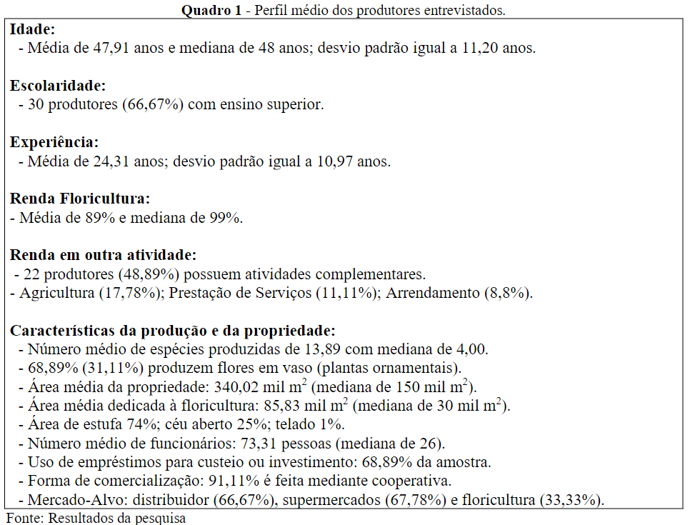 O Quadro 1 sumariza as principais características do produtor e de seu negócio, observadas acima. Revela ainda que a produção de flores e plantas ornamentais foi financiada, em média, com 78,47% de recursos próprios (mediana de 90%). Apesar disso, 68,89% dos agentes pesquisados garantiram ter tido acesso a crédito em algum momento, o qual foi utilizado especialmente para investimento e custeio.