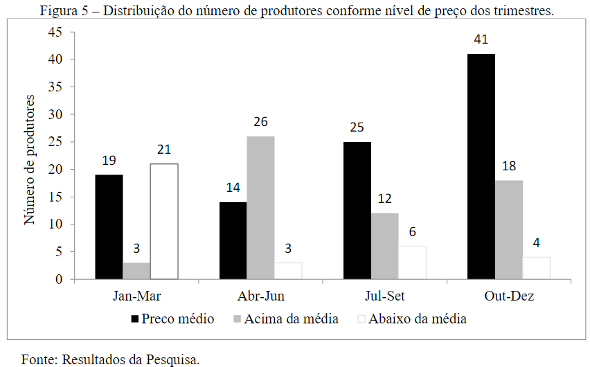 Conforme as respostas dos produtores de flores, o primeiro trimestre, na média, é o período de preços menores, haja vista que para quase metade da amostra o preço do seu principal cultivo sofre queda e se estabelece num patamar abaixo do preço médio – Figura 5. Tal ponto pode ser explicado devido à queda de dinamismo do mercado nesse período em função da ausência de datas comemorativas e da incidência de gastos extras que impactam o orçamento familiar. Importante destacar que essa perda de dinamismo salientada acima não se aplica às plantas ornamentais, já que estas, de acordo com a amostra, mantêm o preço médio por todo o ano. Por outro lado, o segundo trimestre foi apontado por 26 produtores como aquele caracterizado por preços acima da média. Por fim, nos últimos dois trimestres, a maior parte dos produtores indicou que o preço de seu principal produto se mantinha na média. Tais evidências vão de encontro com os resultados de Marques e Caixeta Filho (2002), os quais constataram uma forte relação entre as datas festivas e o comportamento dos volumes de venda e dos preços, reforçando as sinalizações dos produtores entrevistados nesta pesquisa.