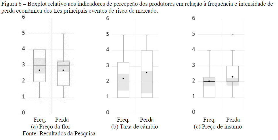 A Figura 6 apresenta a distribuição dos indicadores de percepção dos produtores em relação à frequência e potencial de perda econômica dos três eventos de risco de mercado de maior severidade: oscilação dos preços da flor, da taxa de câmbio e preços dos insumos. Analisando tais eventos, verifica-se a maior severidade desse primeiro, tendo em vista que apresenta os maiores indicadores de frequência de perda econômica.