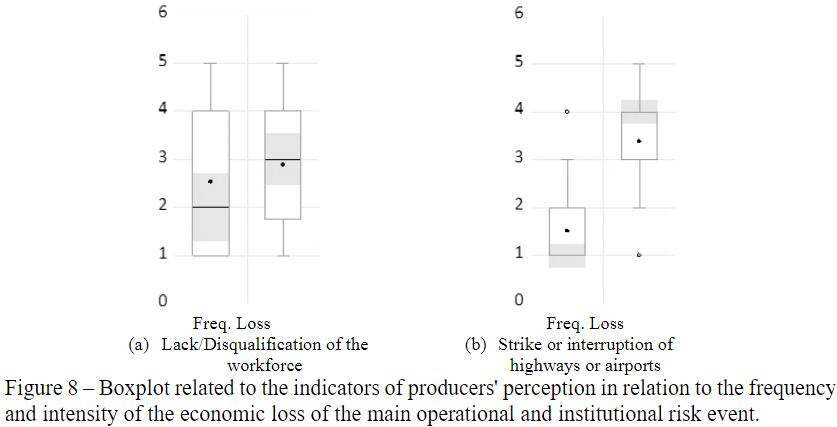 The risk of the institutional environment was also present among the ten events with the highest degree of severity. Although strikes and road interruptions are not considered frequent events, when they occurred the economic impact was very expressive – Figure 8. In floriculture, especially cut flowers, perishability occurs not only in the post-harvest; given the cut-off point, there is no way to “hold” the plant's life cycle – the flower will bloom and, in a few days, will lose the essential characteristics for its commercialization, even if this plant remains in the soil.Regarding credit risks, these were not shown to be preponderant events, since part of the sample is a member of a cooperative. These guarantee support to producers in the face of situations of default and ease of access to financing. In addition, independent producers reported that it is common practice to receive payment in advance or in cash and, therefore, also do not have problems with default.