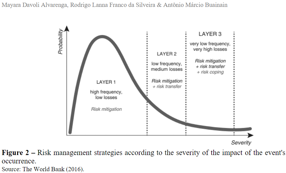 Risk events expose agricultural activities to the possibility of damages and losses, and these are especially due to price fluctuations, weather conditions, the occurrence of pests and diseases, losses during the production and logistics process, especially resulting from disqualification of the handwork, inadequate storage or transport, changes in terms of access to credit, regulations, among other factors. Considering this scenario, anticipating the recognition of the possibilities of adverse events, the prospection of economic impact, the instruments that can be used to avoid, mitigate or face them, and the degree of vulnerability of the agents involved, is part of a management modality with a holistic and integrated approach, proposed by the methodologies developed by the World Bank, Mapa and Embrapa (2015), World Bank (2015a and 2015b) and OECD (2009).
