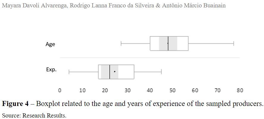 From the interviews carried out, it was observed that the average age of the sample producer was 47 years. Another interesting fact is that the average time of experience in the floricultural activity is 24.31 years, that is, just over half of the average age of the producer – Figure 4, confirming the tradition of producing families in the region. In addition, more than 65% of respondents have a university degree, that is, this is a highly educated group.