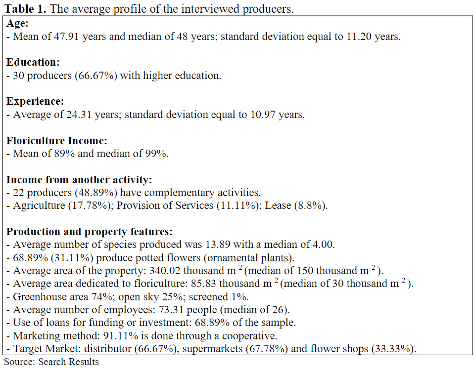For income, almost half of the producers had supplementary income, largely from other types of agricultural activity, in addition to being associated with the provision of services (11.11%), leasing (8, 89%), and rental of machinery and equipment (2.22%) – Table 2. Although 48.89% of producers point to having income from other activities, financial resources from floriculture represent an average of 89% (with a median 99%) of the producer's total income, thus emphasizing the significant importance of the activity to the agents interviewed.
