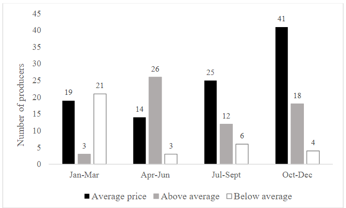 According to the responses of flower producers, the first quarter, on average, is the period of lower prices, given that for almost half of the sample, the price of their main crop drops and settles down to a level below the average price – Figure 5. This point can be explained by the drop in market dynamism in this period due to the absence of commemorative dates and the incidence of extra expenses that impact the family budget. This lower dynamism does not apply to ornamental plants, since these, according to the sample, maintain the average price throughout the year. On the other hand, the second quarter was pointed out by 26 producers as the one characterized by above-average prices. Finally, in the last two quarters, most producers indicated that the price of their main product remained on average. Such evidence is in agreement with the results of Marques and Caixeta Filho (2002), who found a strong relationship between festive dates and the behavior of sales volumes and prices, reinforcing the signs of the producers interviewed in this research.