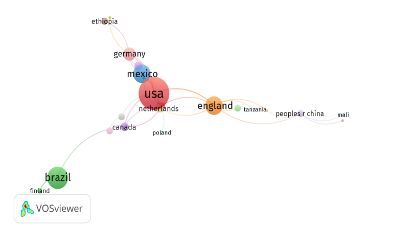 Ao observar a rede, verifica-se que, o cluster(1) de cor vermelha é formado pelo vínculo entre os Estados Unidos, que faz frente com 24 documentos e 358 citações, e a Austrália; e no cluster (2) de cor verde estão o Brasil, com 14 documentos e 16 citações, e a Finlândia. Já o cluster (3) de cor azul é composto pelo México, com 11 documentos, e 11 citações, e Guatemala; e os demais clusters são compostos por apenas um país, sendo o cluster de cor alaranjado composto pela Inglaterra, com 11 documentos e 163 citações; o de cor rosa pela Alemanha, com 7 documentos e 29 citações; o violeta pelo Canadá, com 4 documentos e 17 citações; o marrom claro pela Holanda, com 4 documentos e 40 citações; o marrom escuro pela Etiópia, com 3 documentos e 10 citações; o verde claro Tanzânia, com 1 documento e 3 citações; o violeta claro China, com 3 documentos e 1 citação; e o azul claro composto pelo Mali, com 1 documento e 2 citações, além de outros países com menor relevância.