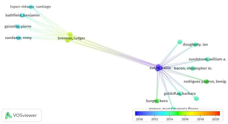Na figura 5, percebe-se a relação dos autores mais citados, no qual as cores representam os anos de publicação. Destaque para os seguintes autores: Hallie Eakin com 111 citações; Christopher Bacon, Barbara Goldoftas, Ian Dougherty, William A. Sundstrom e Maria Eugenia Flores Gomez com 40 citações; Kees Burger com 5 citações; Benjamin Bathfield, Pierre Gasselin, Santiago Lopes-Ridaura e Remy Vandame com 4 citações, dentre outros.