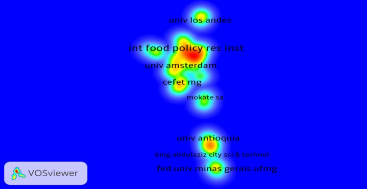 A figura 6, destaca o International Food Policy Research Institute, sede em Washingtom, com 3 documentos e 17 citações e a Universidade de Amsterdam, com 2 documentos e 18 citações, ambos nos EUA; Universidade de Antioquia, sede em Medellin e Antioquia na Colômbia, com 2 documentos e 10 citações; Universidade Los Andes, no Chile, com 2 documentos e 12 citações; e as instituições brasileiras, CEFET/MG e a UFLA/MG, com 2 documentos e 3 citações, a UFMG, com 2 documentos e 1 citação, dentre outras.