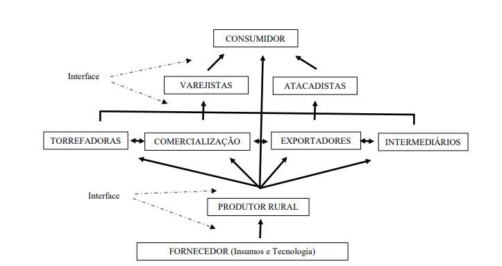 Para a avaliação do sistema produtivo do café, conforme figura 1, é necessário avaliar quantos agentes e setores que existem, compreender as interfaces (se as relações são curtas ou longas e como estão estruturadas), ou seja, nas interfaces que ocorrem os maiores problemas de gestão. Assim, é preciso conhecer as interfaces que a organização possui, verificar nas interfaces as informações referentes aos problemas existentes (as especificidades), se a empresa tem dependência ou não dessa interface (ex. dependência de bancos para financiamentos; dependência da indústria; conhecer os riscos; incertezas; frequência de transações e a dependência; racionalidade dos agentes nas negociações; ações oportunistas, etc.).