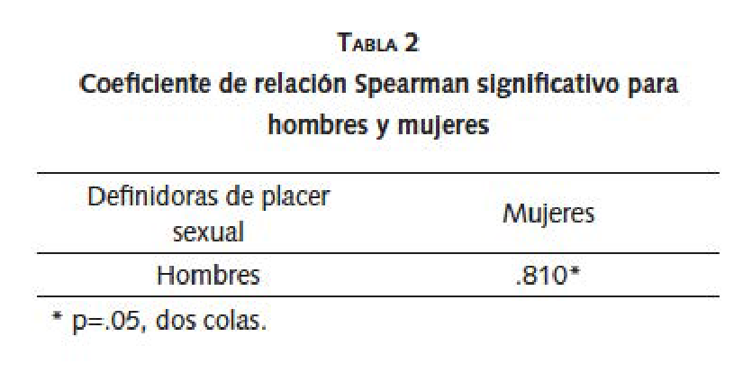 El valor que se obtuvo en el análisis de correlación resultó ser alto para las definidoras que comparten los sujetos, por lo que se observa que los participantes de cada grupo efectivamente asocian dichas palabras de manera similar; por ejemplo, en la tabla 1, la palabra orgasmo ocupa el mismo lugar en la red de mujeres y de hombres respectivamente.