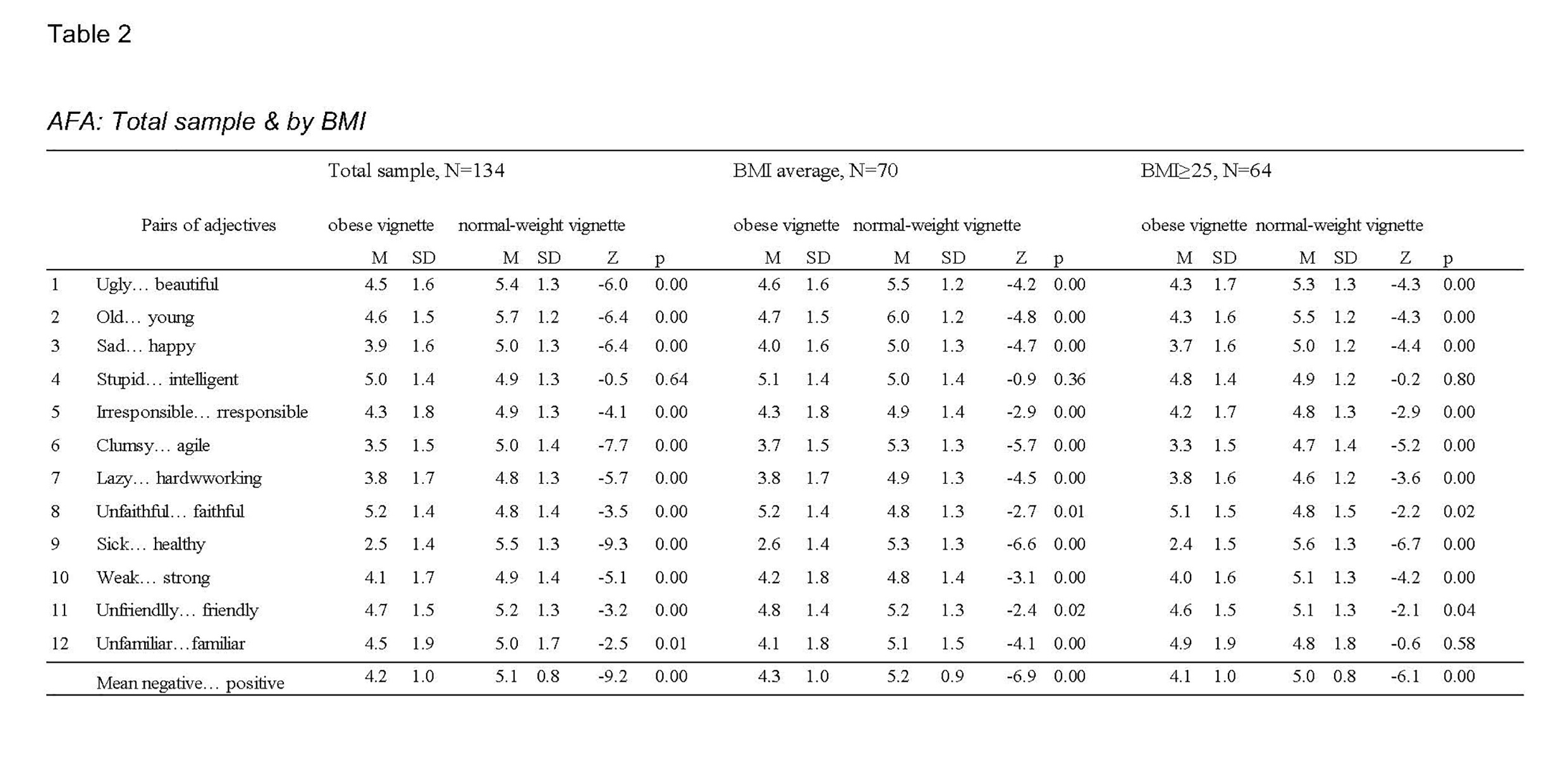 Participants rated the image more negatively when shown as obese relative to average-weight. Still, the average score for the obese images indicated a somewhat neutral, slightly positive attitude (M=4.20, SD=.98; on the scale range: 1 negative to 7 positive). The average-weight image yielded an average score of 5.08 (SD= .84), reflecting positive attitudes. The average-weight image was considered more beautiful, younger, happier, more responsible, more agile, harder-working, healthier, stronger, friendlier, more familiar, but also more unfaithful, versus the obese-weight image. Differences were significant, with the exception for intelligence. This is visually depicted in Table 2. Both BMI groups expressed similar bias and no significant differences were found between the groups, except for familiarity (U=1597, p=.002). The average BMI group considered the image more familiar when presented as the average-weight silhouette relative to the obese-weight image, and the opposite was true for those with BMI≥25. AFA was not correlated with BMI, confirming hypothesis 1.
