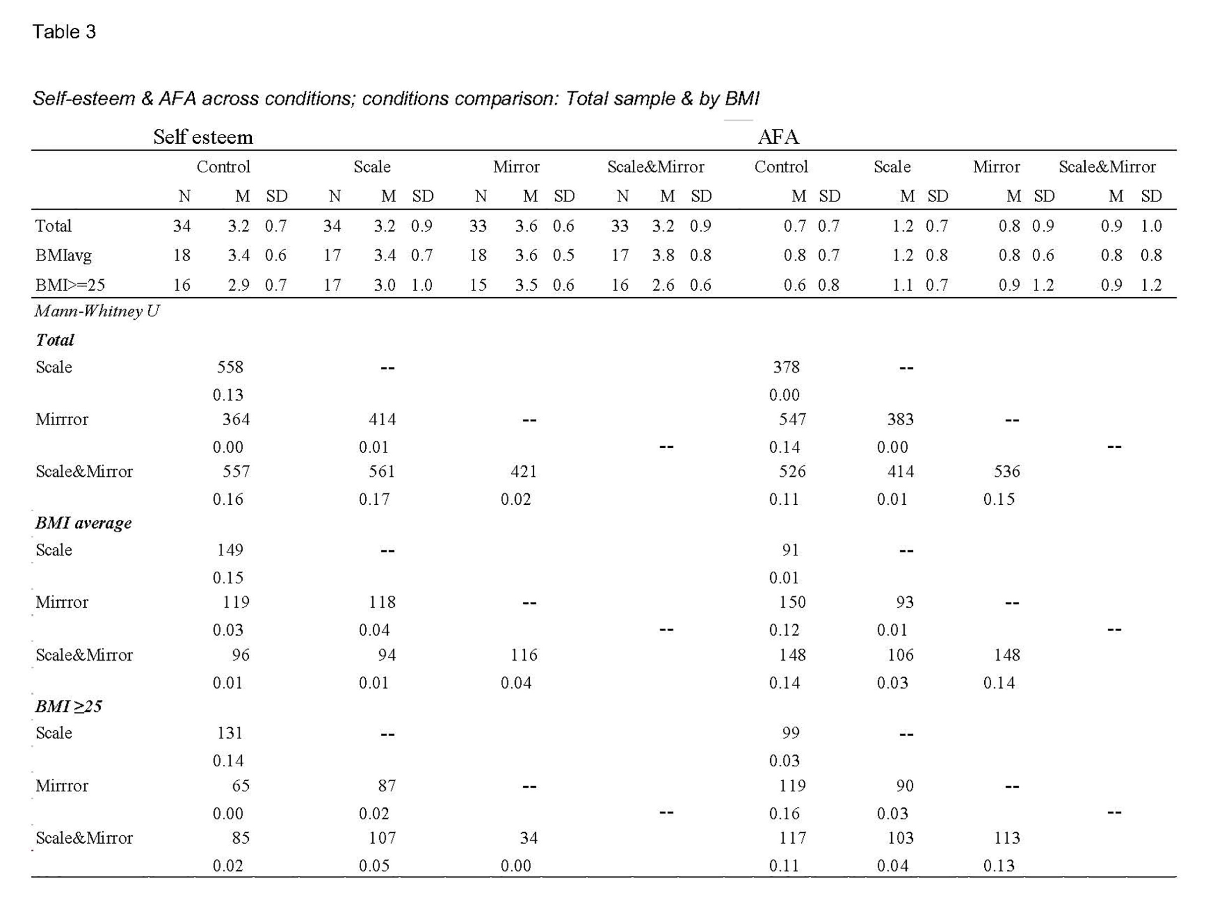 Participants were informed that this was a study on the space that people occupy in their world. AFA was not mentioned to avoid bias. Block randomization was applied when assigning the four conditions. In conditions one, two and three the interviewer instructed participants to focus on their weight and/or figure and asked about their emotions and thoughts to induce the objective self-awareness state. Participants then filled in a self-esteem questionnaire and semantic differentials. Participants in conditions without the scale, were weighed at the end. All the participants were weighed with the OMRON HBF-514C scale to the nearest 0.1 kg without shoes and outerwear. At the end all participants had their height measured with a stadiometer to the nearest half centimeter. In the mirror condition a full-length mirror was used to allow participants to see their full silhouette. After each intervention the participants’ BMIs were calculated at the end of the day and the list of block randomizations were prepared for the following day.