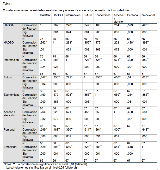 Más adelante se realizó un análisis para conocer correlaciones entre las necesidades insatisfechas, la ansiedad y depresión de los cuidadores, para lo cual se sacó la correlación de Spearman, mostrando las correlaciones significativas que se describen en la Tabla 4.
