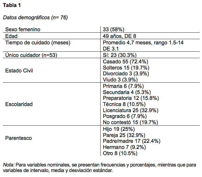 Se incluyeron 76 cuidadores de pacientes oncológicos tratados en una institución privada, en la ciudad de Querétaro, México. Se les invitó a participar, de manera voluntaria, mientras sus familiares se encontraban en el centro recibiendo quimioterapia. El muestreo que se hizo fue por conveniencia, es decir, todos los cuidadores que aceptaran participar en un periodo entre julio de 2018 y julio de 2019. Estos fueron los criterios de selección que se consideraron: que fueran el cuidador primario (la persona que mayor tiempo dedicaba al cuidado del enfermo), que firmara el consentimiento informado, que fuera mayor de edad y que supiera leer y escribir. Se excluyó a los acompañantes que no fueran cuidador primario o que recibieran remuneración económica por los cuidados del paciente.