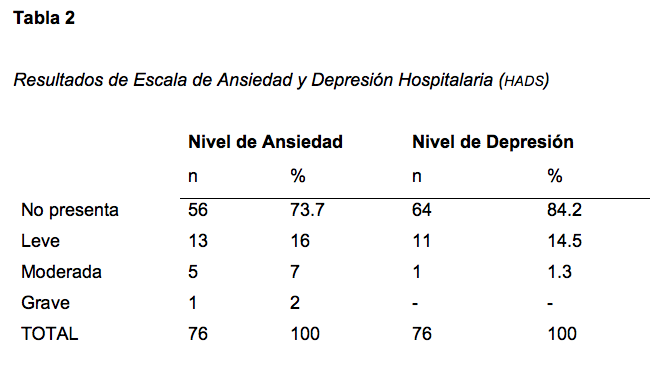 En cuanto a los resultados obtenidos por la Escala de Ansiedad y Depresión Hospitalaria (HADS), se describen los resultados en cuanto a prevalencia de ansiedad y depresión en la Tabla 2.