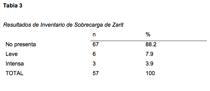 Con relación a la prevalencia de sobrecarga del cuidador, evaluada con el Inventario de Sobrecarga de Zarit, se observó que el 88.2% no experimenta sobrecarga; mientras el 12% restante perciben la carga entre leve e intensa (Tabla 3).