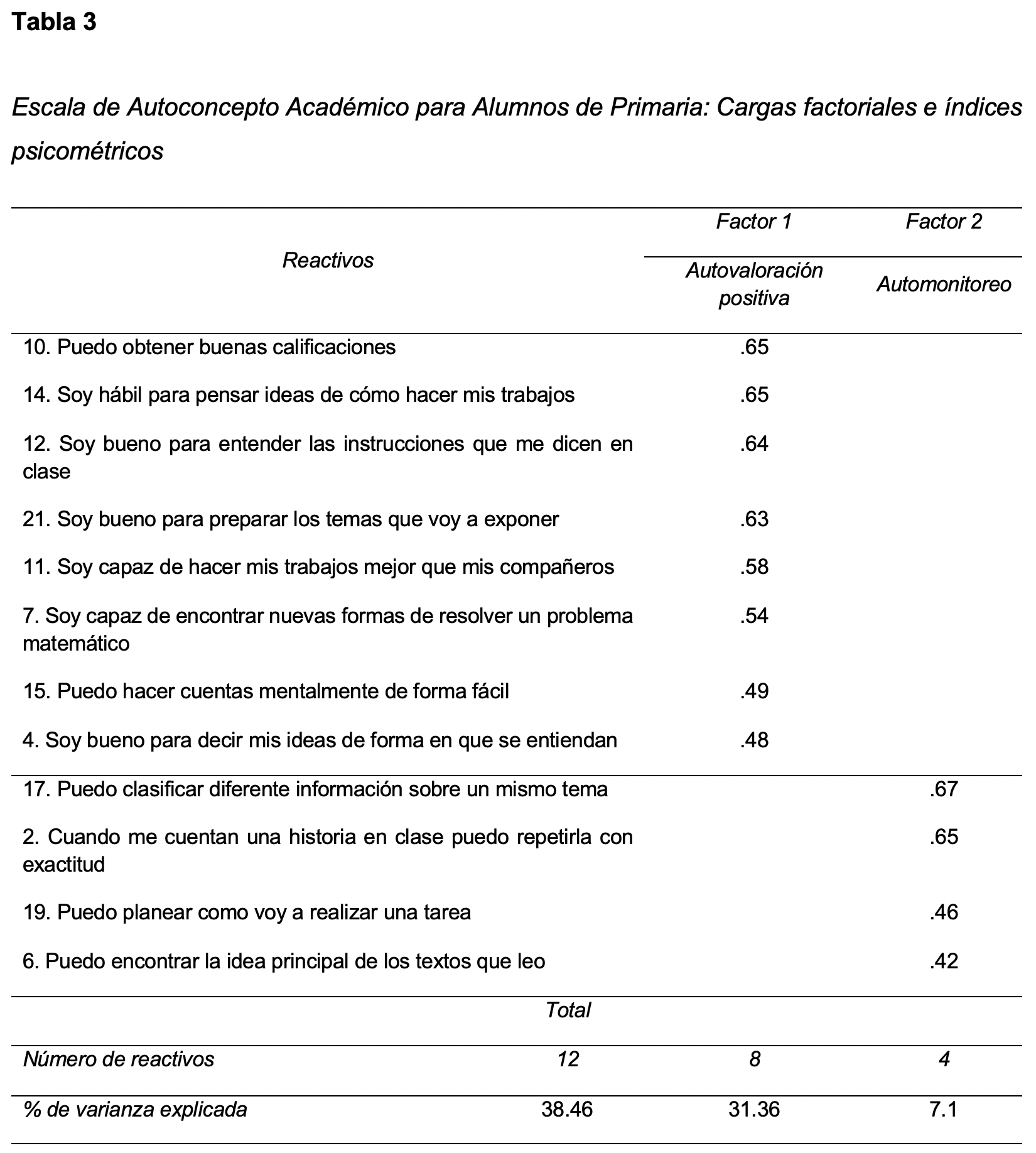 Respecto con las bases teóricas, la escala incluyó ítems de matemáticas y contenidos lingüísticos propuestos en el modelo de dos factores de Byrne y Shavelson (1986) y Marsh (1990), que en este caso particular conformaron los factores de autovaloración positiva y automonitoreo. El primero de éstos fue más congruente con una percepción positiva sobre la capacidad para realizar actividades escolares, tales como; trabajos, exposiciones y resolución de problemas, mientras que el otro se refirió a la percepción vinculada con la capacidad para ejecutar procesos cognitivos, especialmente asociados con las habilidades verbales, como encontrar la idea principal, y repetir y clasificar información.