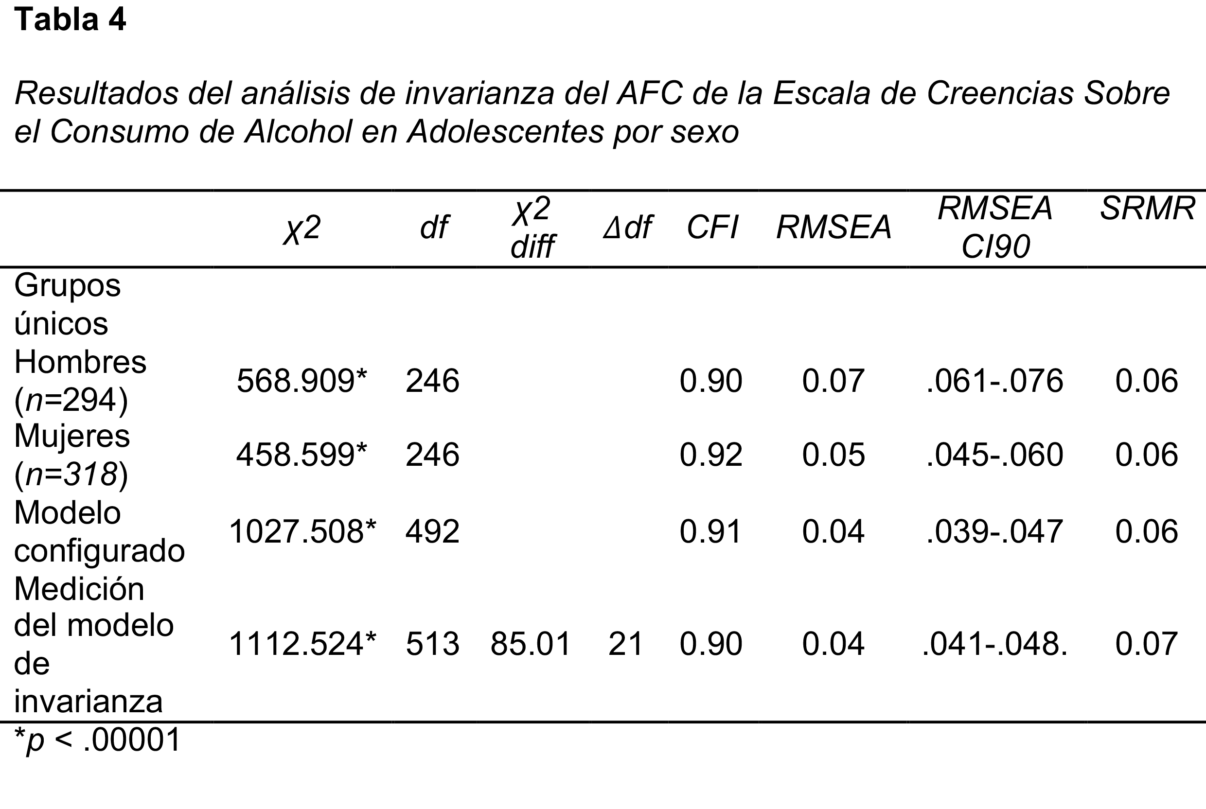 Para este análisis se dividió la muestra por sexos (hombres=294 y mujeres=318). Se sometieron a prueba dos AFC, uno para cada sexo y presentaron un ajuste adecuado por grupo. Dos AFC adicionales fueron sometidos a prueba. El primero llamado modelo configurado, el cual evalúa si el número de factores y sus cargas son equivalentes entre grupos (Brown, 2006). Este modelo mostró un adecuado ajuste, lo que indica equivalencia entre grupos. El último AFC evaluó la igualdad en las cargas factoriales y covarianzas de los errores, lo que indica la especificación de restricciones de igualdad para todas las cargas de factores libremente estimadas en ambos modelos (Byrne, 2012), el análisis indicó un ajuste adecuado (ver Tabla 4).