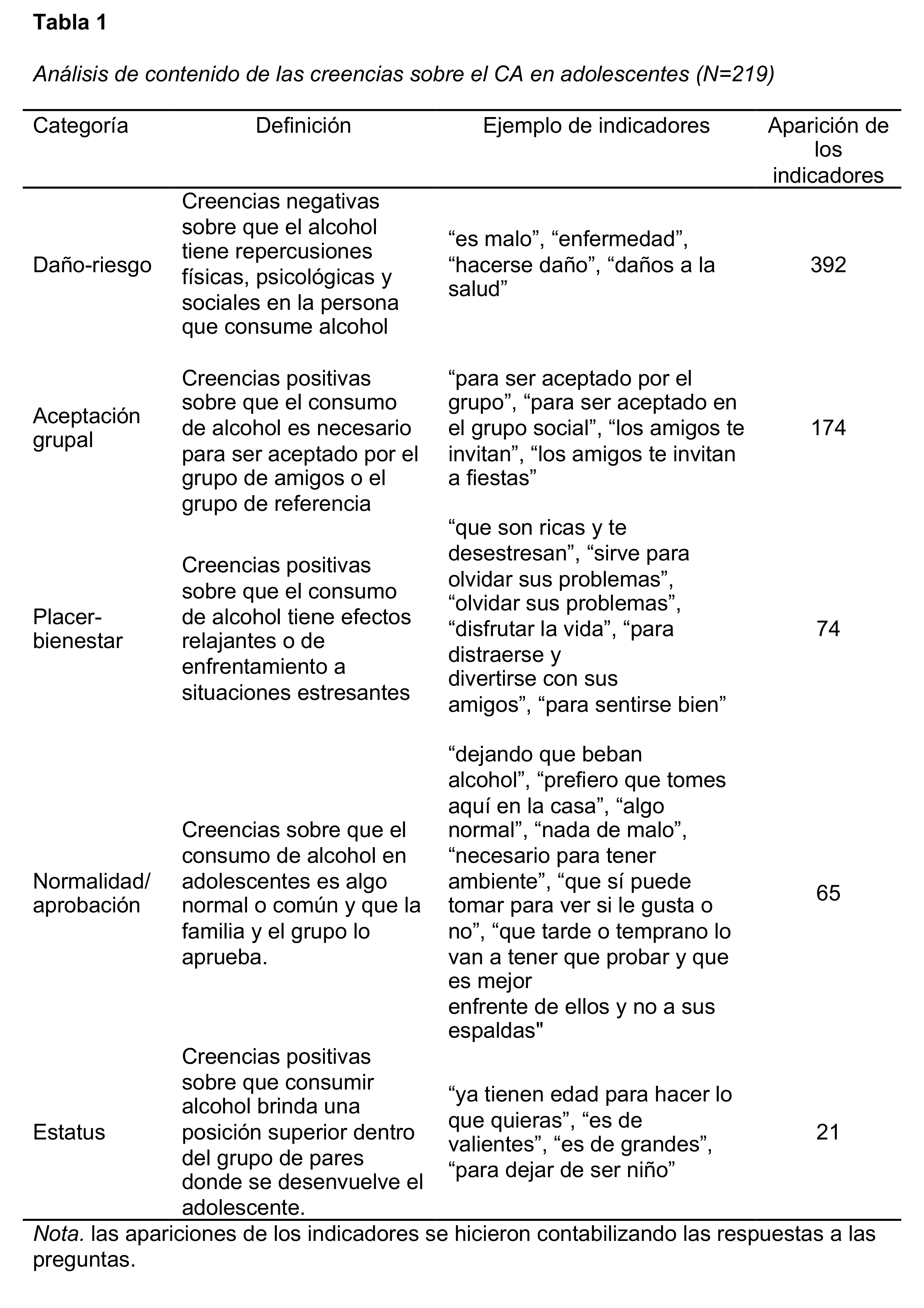 Estudios con adolescentes indican que las principales creencias sobre el CA son las asociadas con: diversión y relajación, poder conocer gente nueva, olvidar problemas, conseguir pareja, divertirse con amigos, sentirse integrado y tener estatus, estas creencias están vinculadas con los aprendizajes culturales y sociales (Martínez-Cardona et al., 2019), con los amigos y la familia y están relacionadas con las actitudes positivas ante el consumo (Tavares et al., 2019).