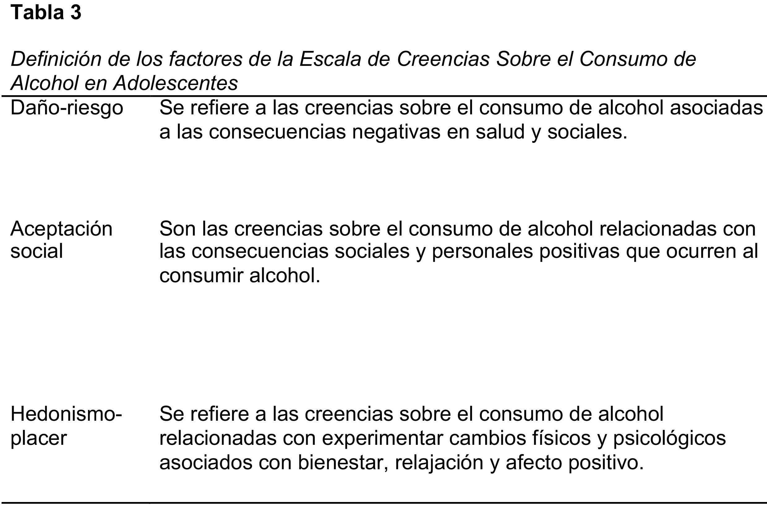 Escala de Creencias Sobre el Consumo de Alcohol en Adolescentes (Piloto 2). Con una escala de respuesta tipo Likert de cuatro puntos (1 = nunca a 4 = siempre). Compuesto por tres factores: Daño-riesgo, Aceptación social y Hedonismo-placer.