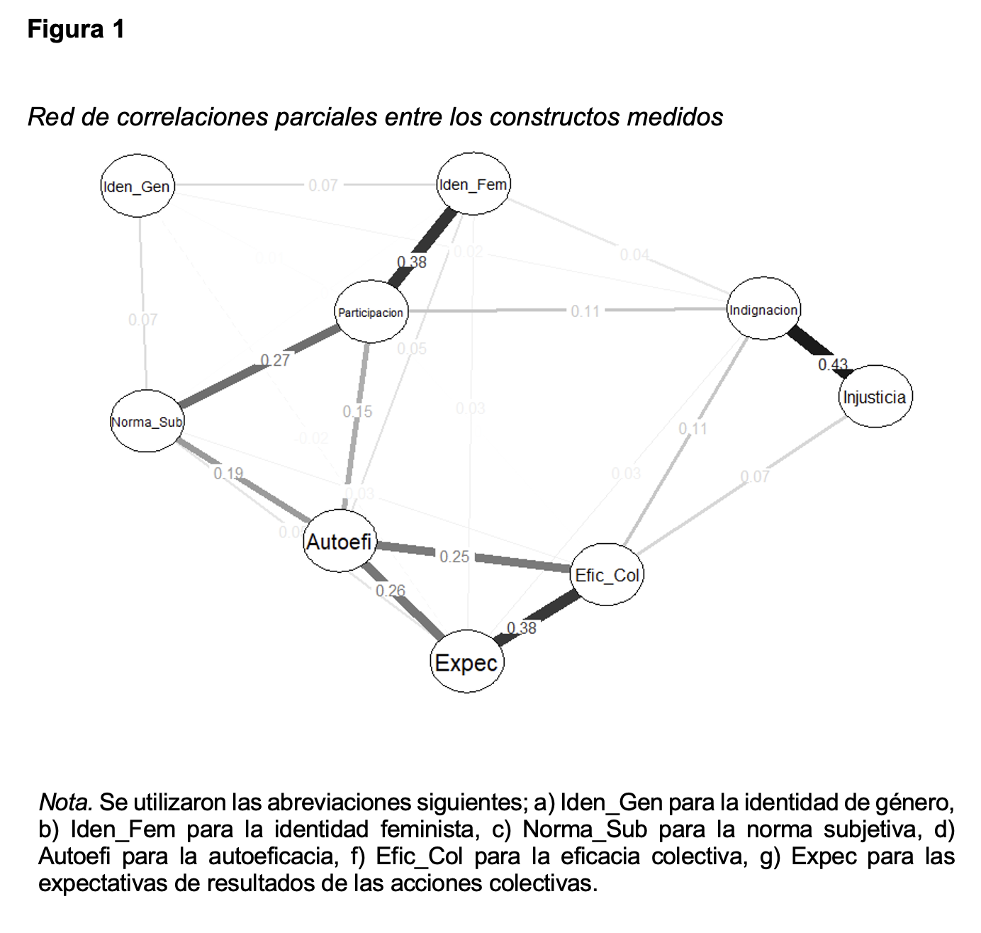 Como se muestra en la Figura 1, en la red de correlaciones parciales, las creencias relacionadas con la eficacia se correlacionaron positivamente y moderadamente entre ellas, siendo la relación entre eficacia colectiva y expectativas de resultados la más fuerte. Por su parte, y como se esperaba, la indignación y la injusticia se correlacionaron fuertemente de manera positiva. Así mismo, la participación en acciones colectivas se relacionó en orden de fuerza con la identidad feminista, la norma subjetiva, la autoeficacia y la indignación. La identidad de género se relacionó débilmente con la norma subjetiva y con la identidad feminista. También se puede observar que la autoeficacia “controló” la relación entre la participación y la eficacia colectiva y las expectativas de resultados.