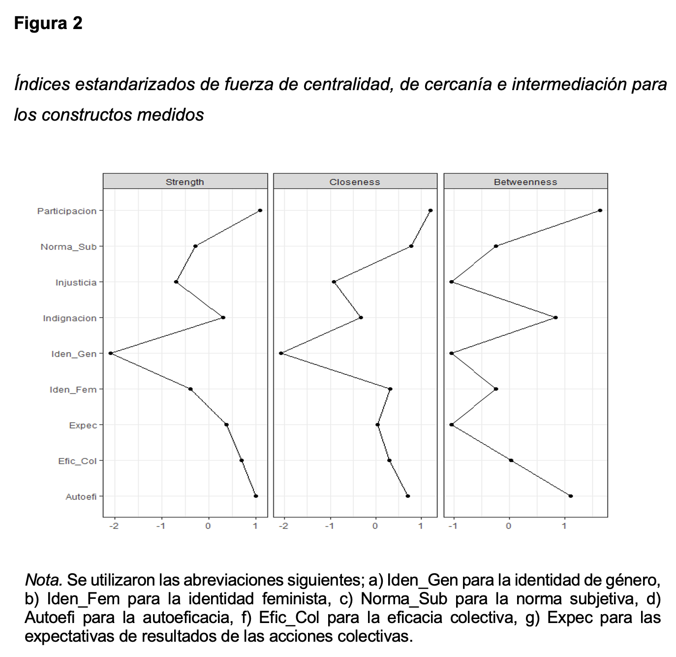 En la Figura 2, se pueden observar los índices de centralidad de fuerza, de cercanía y de intermediación. La identidad de género es la variable con menos centralidad de fuerza y de cercanía. Es decir, la identidad de género fue la variable con menos relaciones y fue la que más alejada estuvo del conjunto de variables de la red. Por su parte, la participación tuvo altos niveles de centralidad de fuerza, de cercanía y de intermediación. Fue una variable con alto número de conexiones en la red, con gran cercanía a todas las demás y la variable con el mayor control de interacciones con las demás (es decir, fue la variable que más conectaba a las otras variables). También se puede observar que la autoeficacia y la indignación fueron variables con alta centralidad de intermediación, siendo congruente con la red dado que la autoeficacia controlaba la relación entre la eficacia colectiva, las expectativas de eficacia y la participación. Por su parte, la indignación controlaba la relación entre la participación y la percepción de injusticia. Por último, la identidad feminista fue una variable con moderados índices de centralidad de fuerza, de cercanía y de intermediación, siendo este último índice el más alto, lo cual significa que la identidad feminista tuvo como principal característica controlar las relaciones entre las variables de la red.